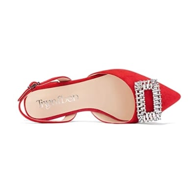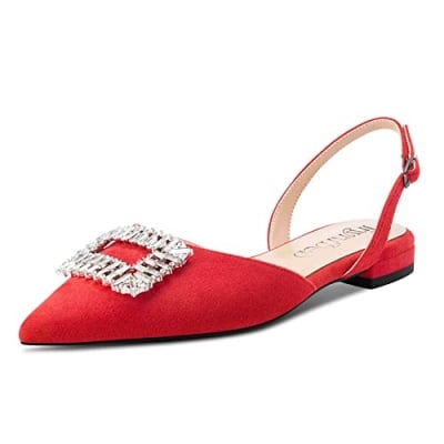 TNYNFBEB Women Chunky Block Low Heel Pointed Toe Flats Shoes Slingback Buckle Rhinestone Crystal Party Cute 0.6 Inches Heels Red