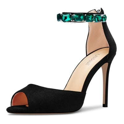 Ladies High Heels Stiletto Pumps Ankle-Strap with Gemstone Peep-toe Sandals Suede 4 Inches Heel