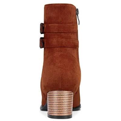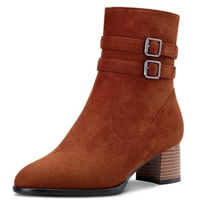 DearOnly Womens Short Bootie Ankle Boots Mid Calf Pointed Toe Block Chunky High Heel Suede Dress Shoes Vintage Classic Zipper Dark Brown 2 Inch