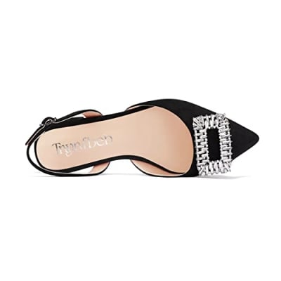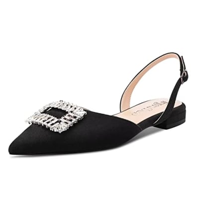 TNYNFBEB Women Chunky Block Low Heel Pointed Toe Flats Shoes Slingback Buckle Rhinestone Crystal Party Cute 0.6 Inches Heels Black