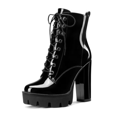 Women's Round-Toe High Heel Platform Ankle Boots with Zipper, 4.7-Inch Chunky Heels Short Boots, Adjustable Laces for Winter Shoes, Sexy Patent Leather Boot Comfortable Outdoor Footwear