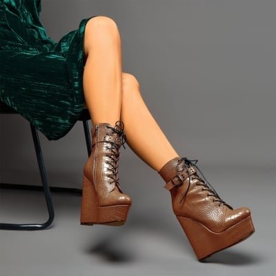 Crocodile Textured Ankle Boots with Zipper, Lace-up, and Ankle Straps – 2-inch Platform Bootie, 6-inch Heel Shoes