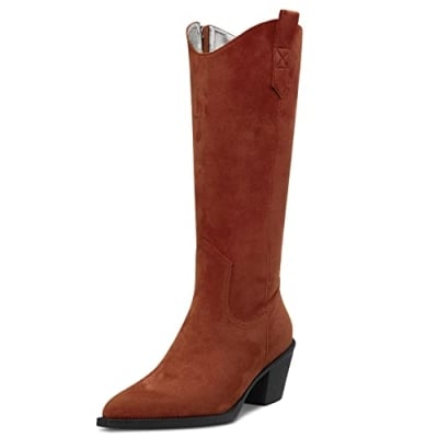 DearOnly Womens Western Cowboy Cowgirl Boots Mid Calf Pull-Up Closed Pointed Toe Block Chunky Heel Zipper Suede Dress Shoes Classic Dark Brown 2.5 Inch